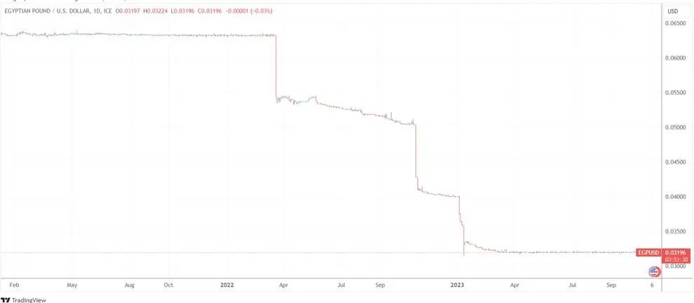 作为拿到 IMF 流动性支持的条件之一,埃及央行自 2022 年 3 月开始已经主动引导埃镑贬值过三回。埃镑兑美元的汇率在过去一年半里贬值了将近一半。