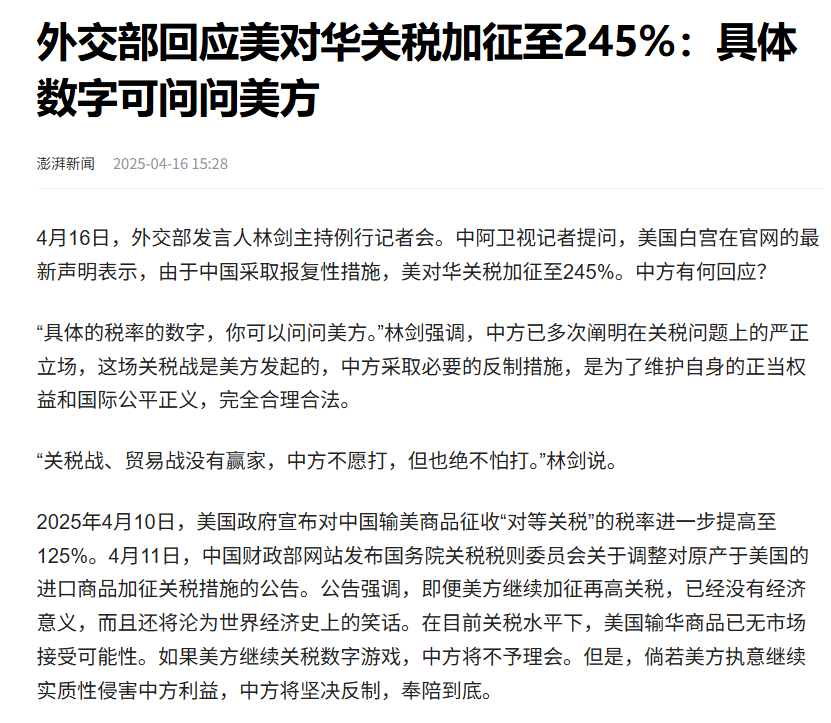 4月16日,外交部对“美对华关税加征至245%”进行了回应。