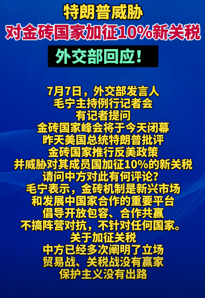 7月7日,外交部发言人毛宁主持例行记者会。有记者提问,金砖国家峰会将于今天闭幕,昨天美国总统特朗普批评金砖国家推行反美政策,并威胁对其成员国加征10%的新关税,请问中方对此有何评论?