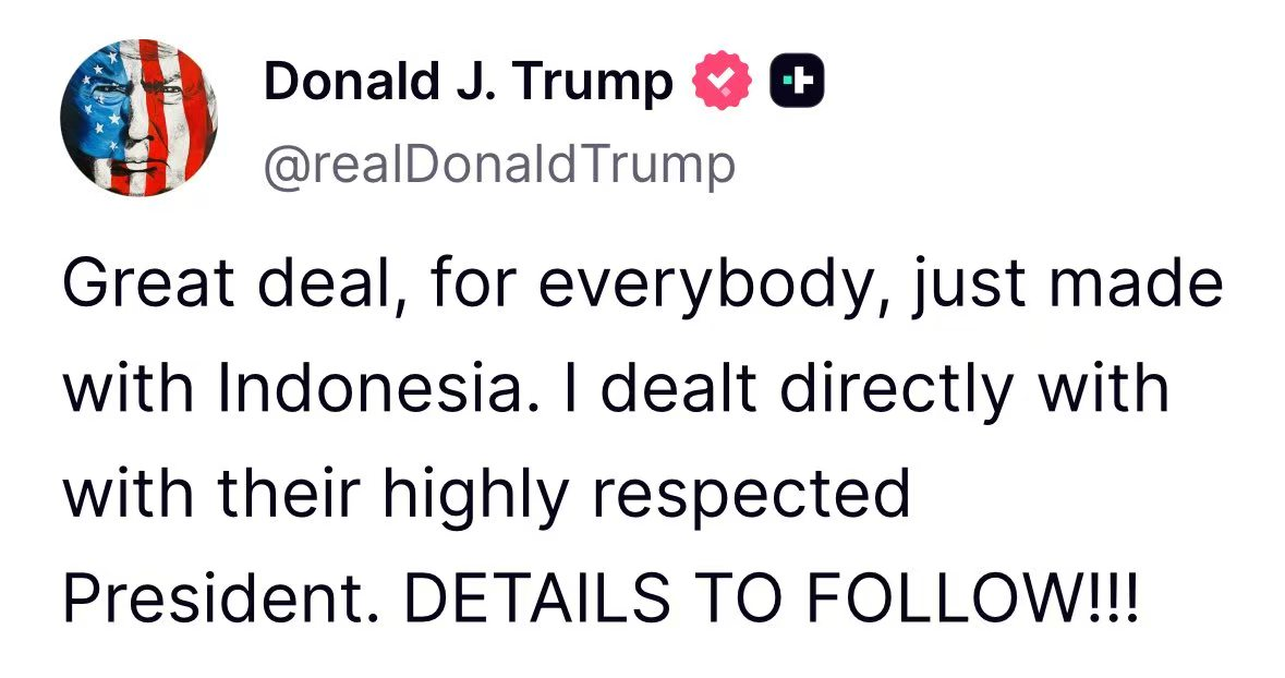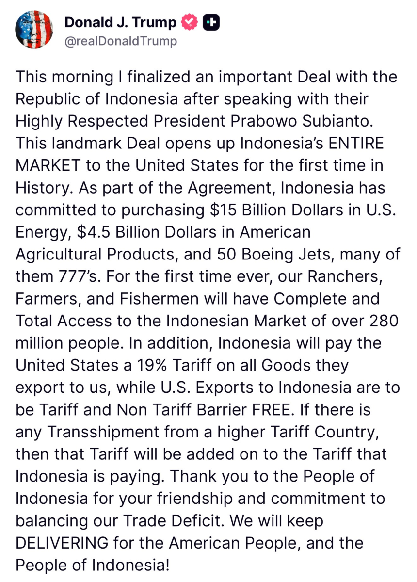 特朗普当天通过社交媒体表示,他当天与印尼总统普拉博沃通电话,双方达成一项重要协议。“这项具有里程碑意义的协议首次将整个印尼市场向美国全面开放。”