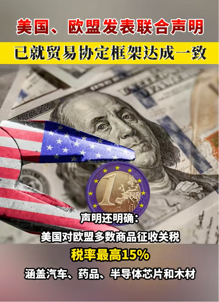 有分析指出,该框架协议将重塑美欧之间的关税格局。双方敲定的联合声明为数周内降低欧洲汽车关税并化解其他贸易摩擦铺平了道路。
