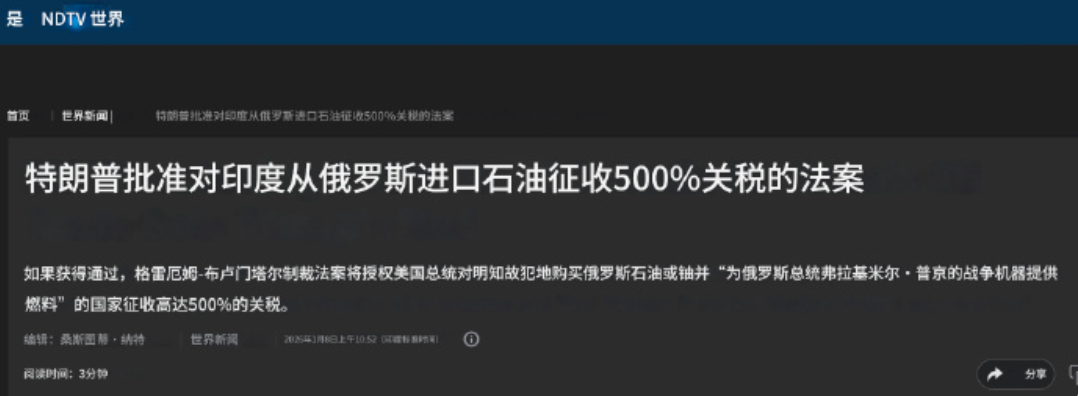该法案提议授权总统对继续购买俄罗斯石油、天然气或铀的国家(如印度、中国、巴西等国)征收高达500%的关税。即对从这些国家出口到美国的商品和服务,加征至少500%的关税。目的是切断俄罗斯的战争资金来源,迫使俄罗斯在乌克兰问题上让步。
