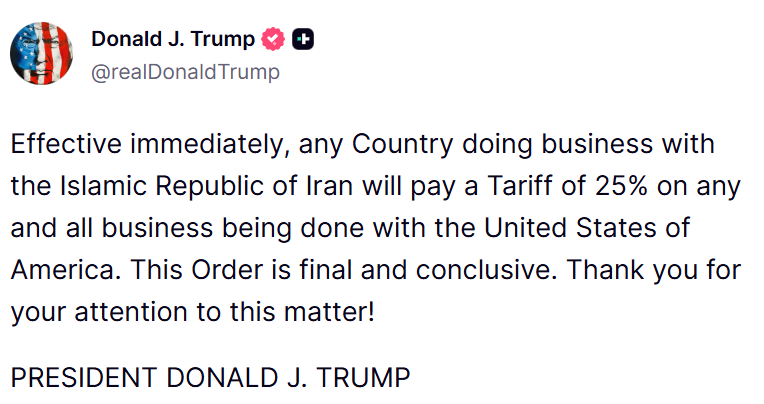 特朗普周一在社交媒体上发文称,这项新关税将立即生效,但未提供更多细节。政府尚未发布文件说明征税范围,特朗普也并未明确说明其如何界定“与伊朗开展业务”。